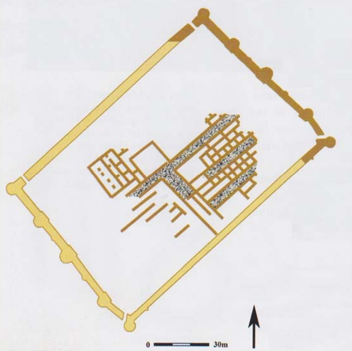 consists of regular planned buildings with square and rectangular rooms with stone