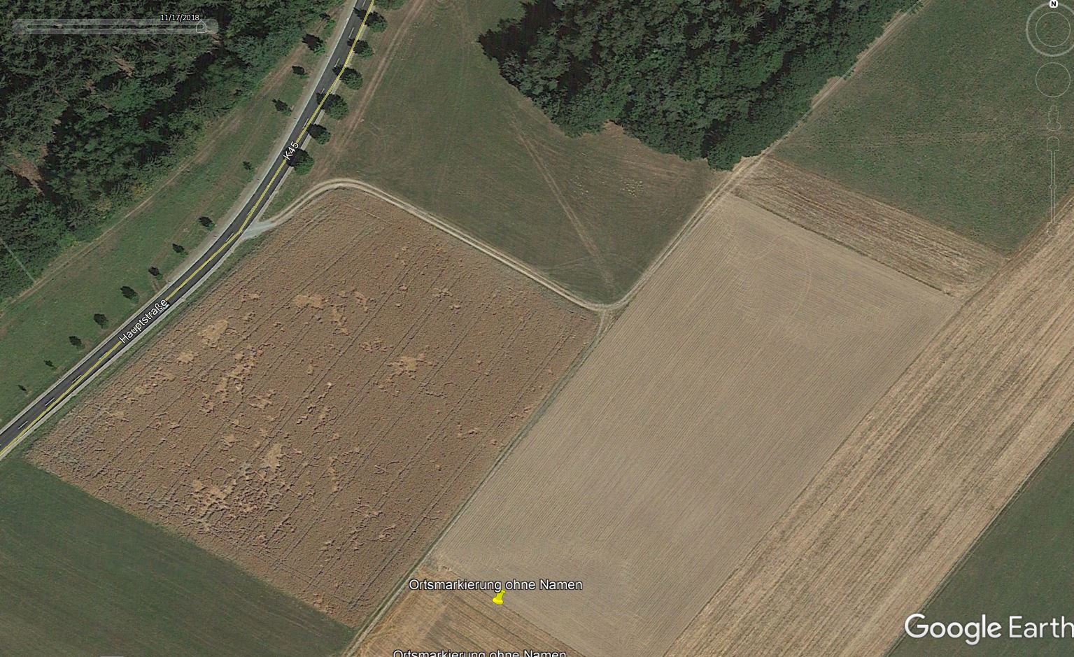 Auf einer Distanz von 400m auf Luftaufnahmen sichtbares Positives Bewuchsmerkmal des Limes Pfahlgrabens